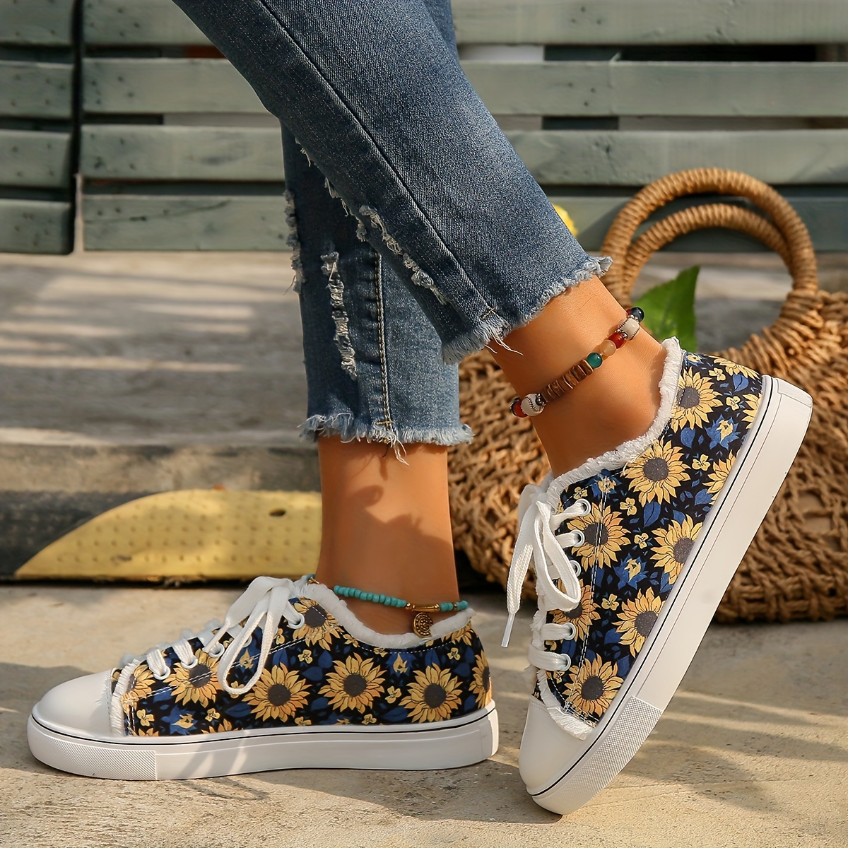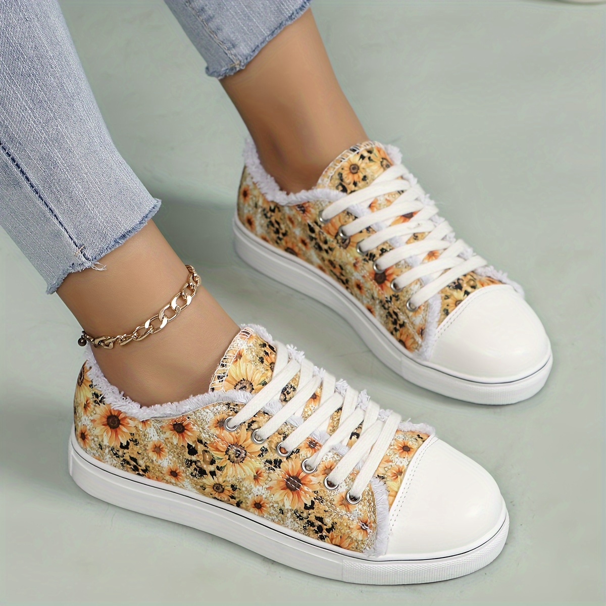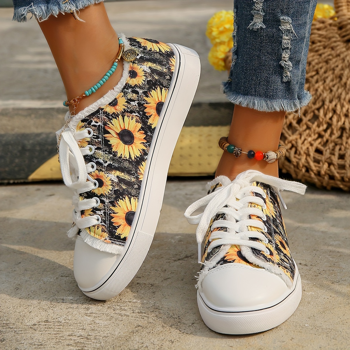 Women's Sunflower Printed Canvas Shoes, Casual Lace Up Outdoor Shoes, Lightweight Low-cut Walking Shoes