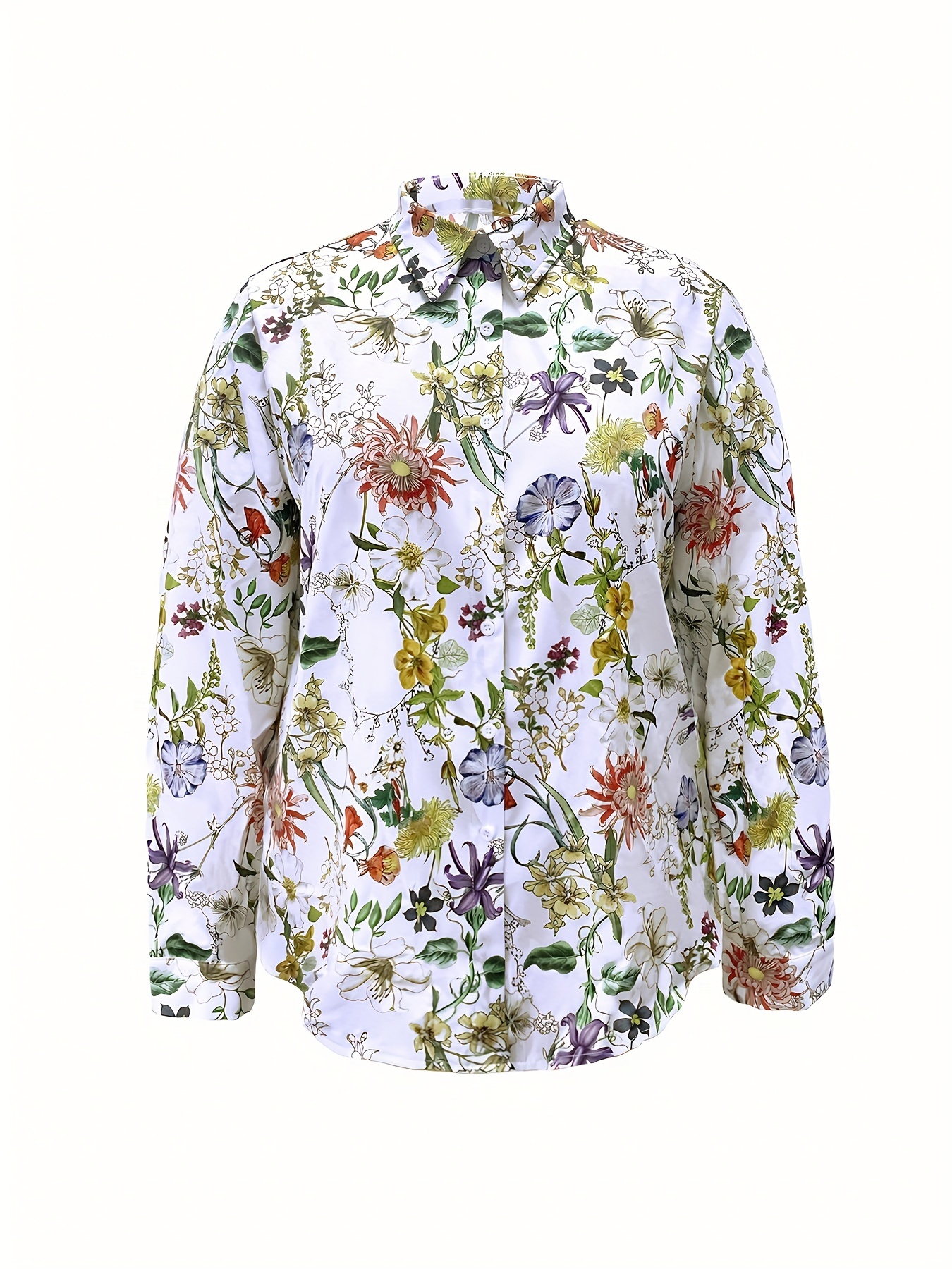Plus Size Womens Floral Delight - Long Sleeve Button Up Blouse with Turn-Down Collar - Flowy, Medium Stretch, Casual Allover Print Shirt Top for All-Season Style