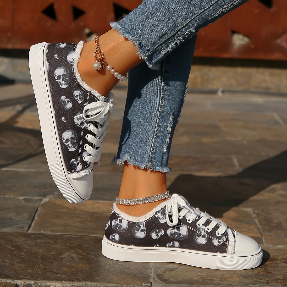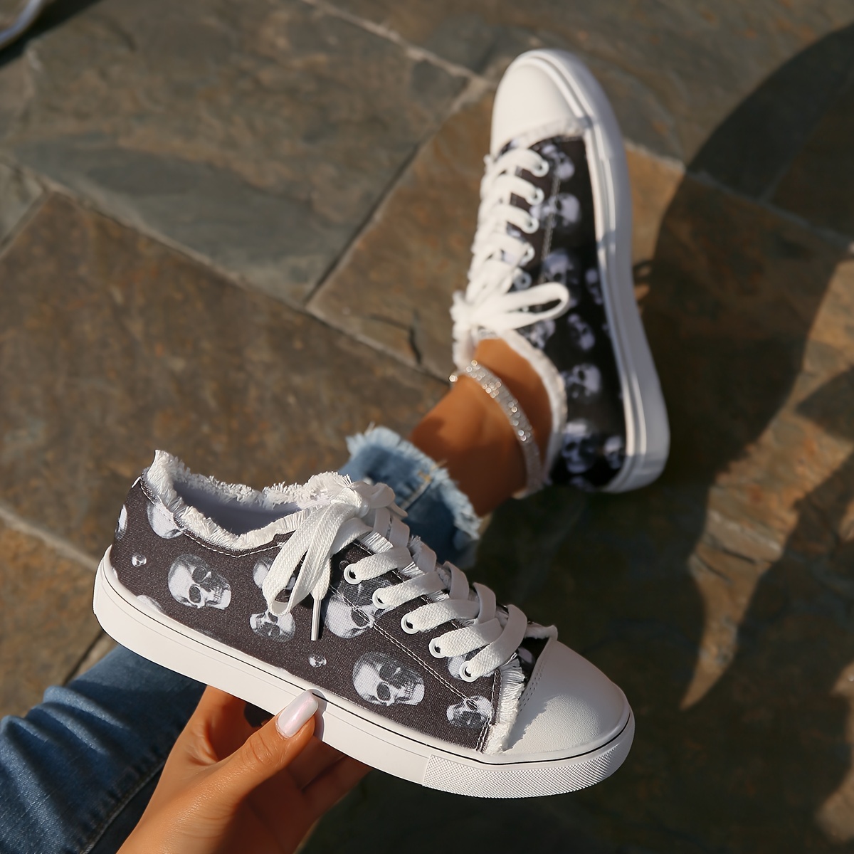 Women's Flat Canvas Sneakers, Halloween Skull Print Low Top Skate Shoes, Casual All-Match Walking Shoes